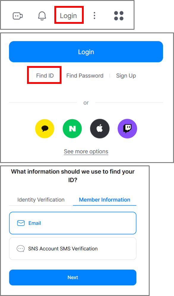 → Click “Find ID/Password” at the bottom → Member Information → Email