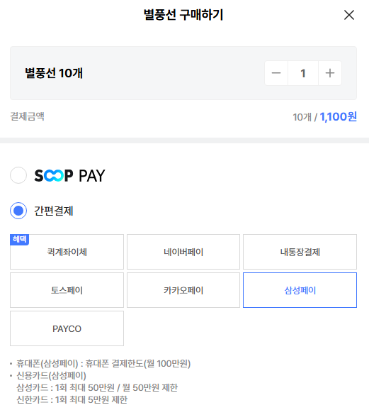 - Mobile billing (Samsung Pay): Monthly limit of 1,000,000 KRW