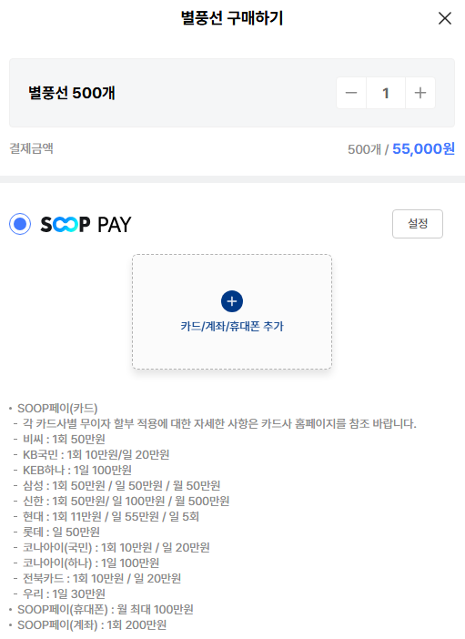 - SOOP Pay (Mobile): Up to 1,000,000 KRW per month