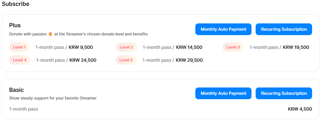 - Available payment methods for auto-recharge: SOOP PAY, Credit Card, Kakao Pay, PAYCO, Mobile Payment
